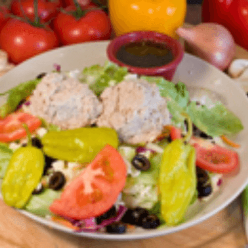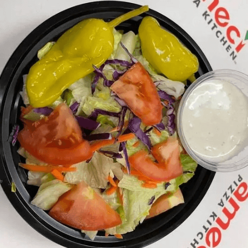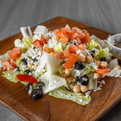 Lettuce, red cabbage, garbanzo beans, black olives, shredded mozzarella, tomatoes and pepperoncinis