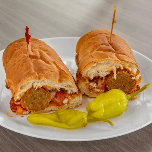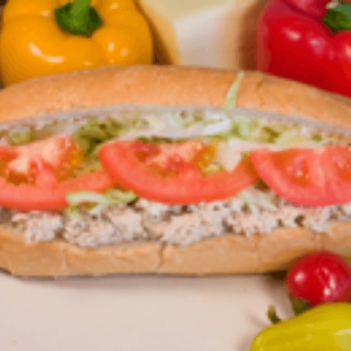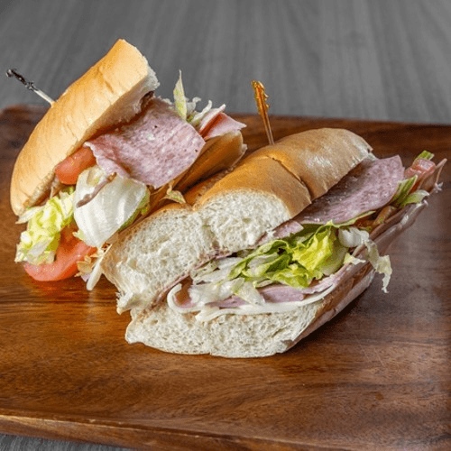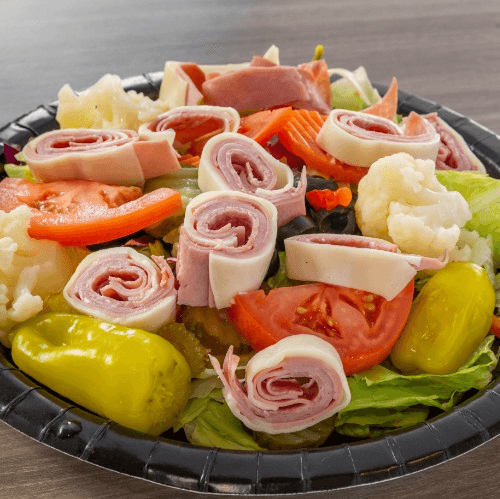 Lettuce, red cabbage, ham, salami, mortadella, provolone, tomatoes, black olives, peppers and giardinera