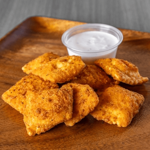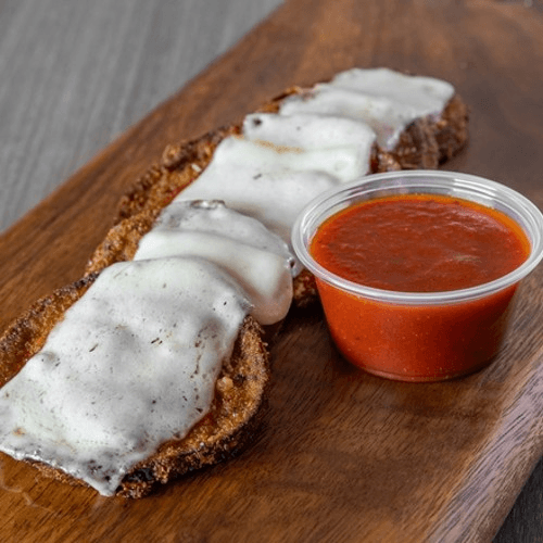 Circle shaped pasta stuffed with ricotta. Cheese with marinara sauce. All served with garlic bread