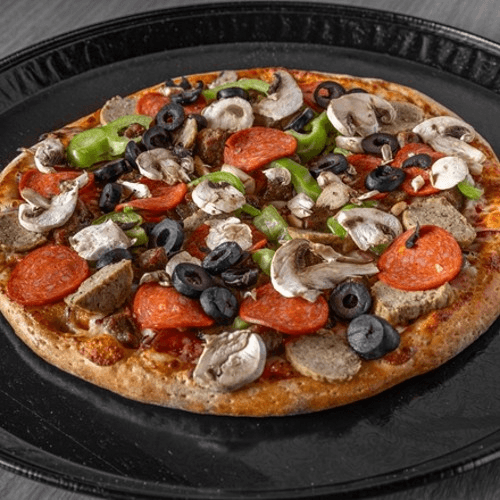 Pepperoni, sausage, meatballs, mushrooms, onions, green peppers and black olives