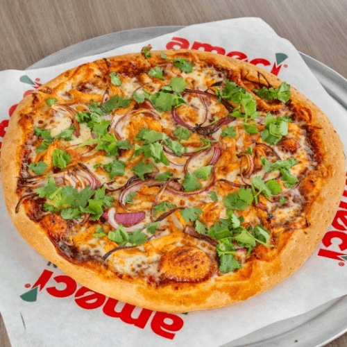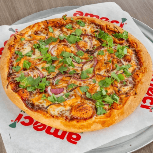 Mozzarella, BBQ sauce, chicken breast, red onions and cilantro